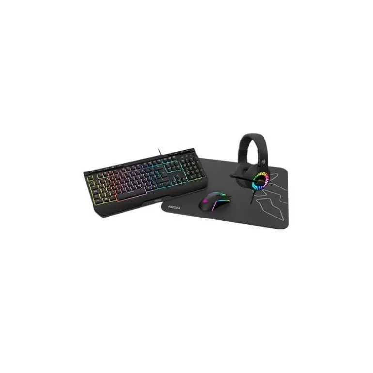 Completa tu setup gaming con el pack Krom Kenya, que incluye un teclado de membrana con retroiluminación RGB, un ratón ergonómico con sensor óptico de hasta 8000 DPI, auriculares estéreo con sonido envolvente de 50 mm, y una amplia alfombrilla speed de 450 x 400 mm.