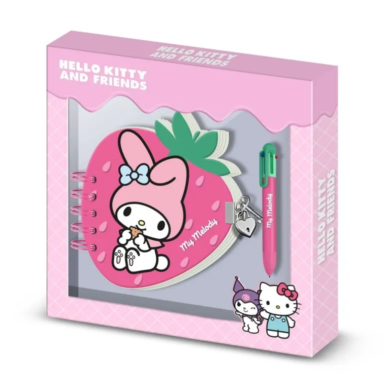 Descubre el encantador Pack de Diario Fresa de Hello Kitty My Melody. Este conjunto incluye un diario de tapas rígidas con forma de fresa y diseño decorativo impreso, acompañado de un bolígrafo de seis colores. El diario cuenta con 80 hojas blancas con un sutil motivo de personaje y viene con un candado y dos llaves para mantener sus pensamientos seguros.