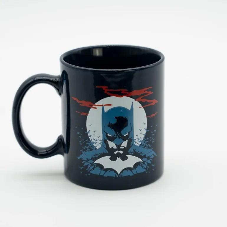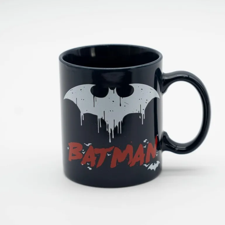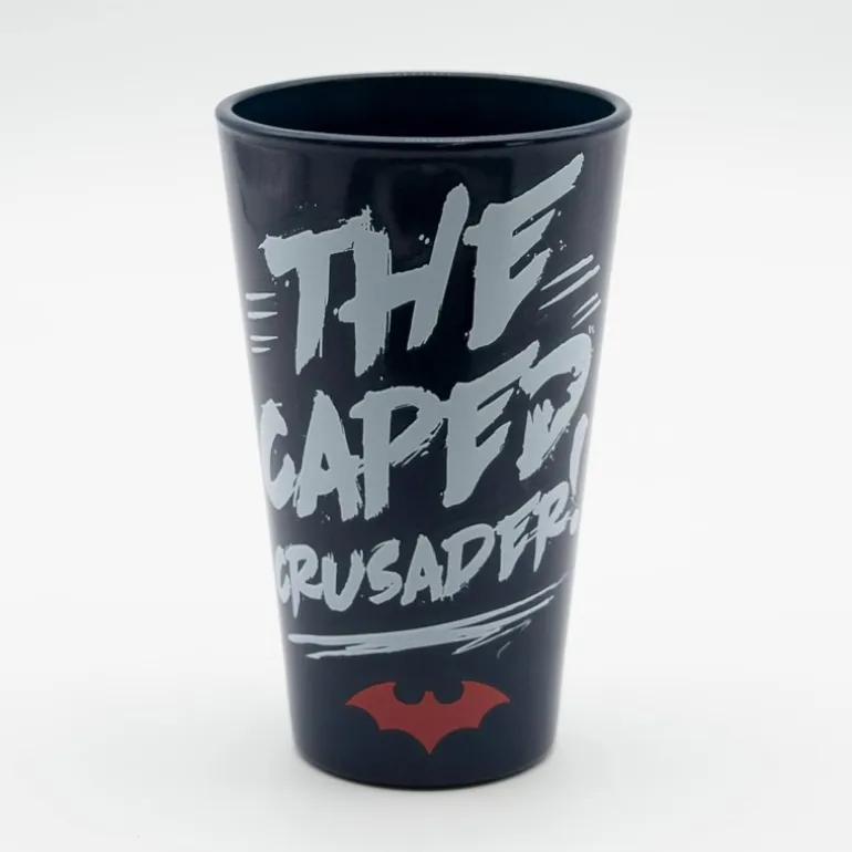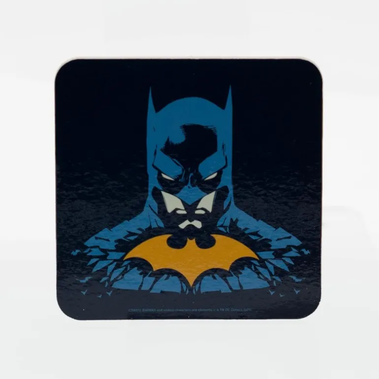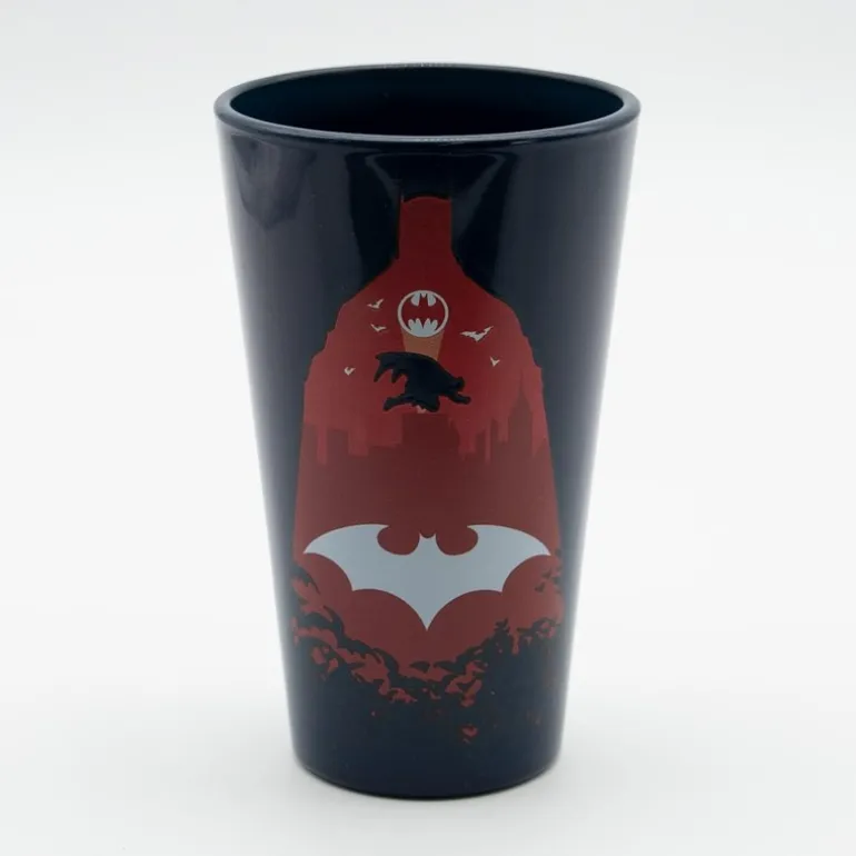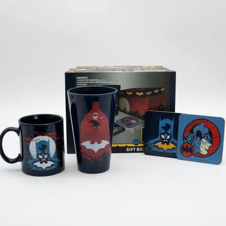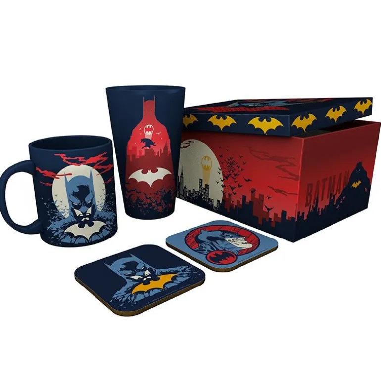 Incluye una taza de cerámica de 33cl, un vaso de cristal de 400ml y dos posavasos, todos con diseños icónicos del caballero oscuro sobre un vibrante fondo de ciudad gótica en tonos negros, rojos y amarillos.