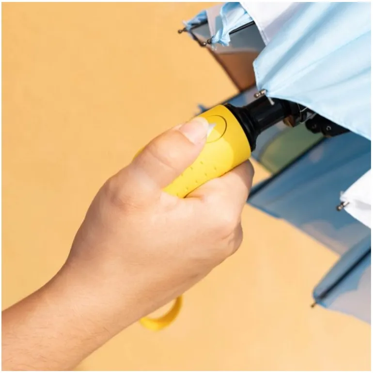 Con un sistema de apertura automática activado por un botón en el mango, también de PVC, este paraguas combina comodidad y funcionalidad. Al cerrarse, se asegura con un práctico cierre de velcro. Al abrirlo, alcanza un diámetro de 100 cm y una altura de 57 cm, proporcionando una excelente cobertura bajo la lluvia.