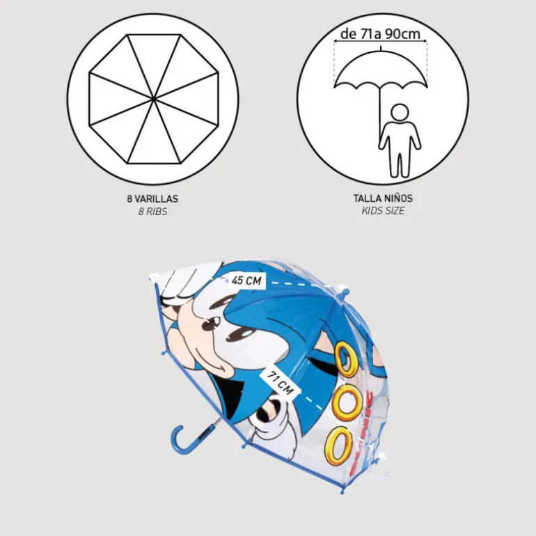 El Paraguas Manual de Burbuja Sonic color Blue es un producto de alta calidad ideal para los fans más pequeños de Sonic. Fabricado con una composición de 100% Poe, este paraguas cuenta con un diámetro de 45 cm, que ofrece una excelente protección contra la lluvia.