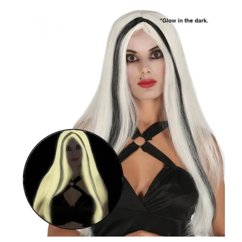Peluca con brillo en la Oscuridad con mechas. Perfecto en fiestas del terror como Halloween. Ideal para nuestros disfraces de Brujas. ¡Compra en un e-commerce como y apoya el comercio español!
