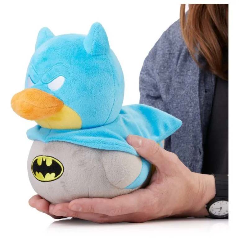 El diseño presenta al querido personaje en una forma transformada, con un curioso casco azul, expresivos ojos bordados y un pico anaranjado que le da un carácter único. El emblemático logo de Batman destaca en color amarillo y negro sobre un fondo gris en la parte delantera, asegurando que este peluche no pase desapercibido.