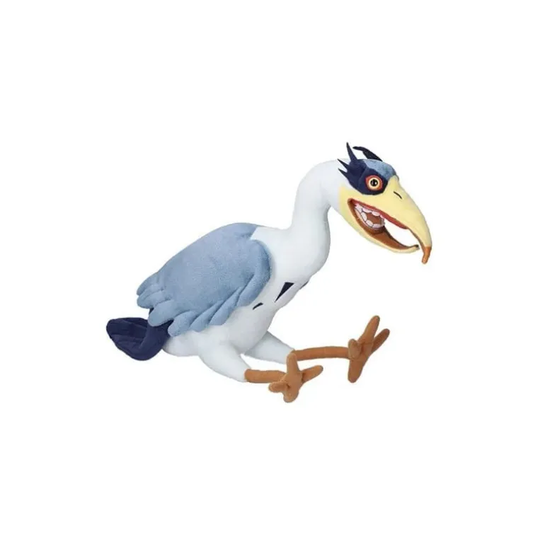 El peluche destaca por su diseño colorido y vibrante. Su cuerpo principal es blanco, mientras que sus alas presentan un tono azul suave con un distintivo patrón detallado. La cabeza del peluche está adornada con un pico amarillo y una expresión amigable que captura perfectamente la esencia del personaje. Las patas largas y delgadas de color marrón claro le dan un toque realista y encantador.