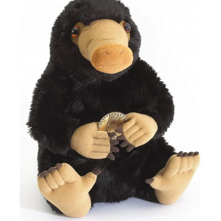 Se trata de un peluche de gran calidad tanto en materiales como en acabados del adorable Escarbato (o Niffler originalmente), esa criatura tan cuqui con morro de pato que vimos en Animales Fantásticos y Dónde Encontrarlos, que aparece aquí sujetando una moneda brillante como tanto le gustan.