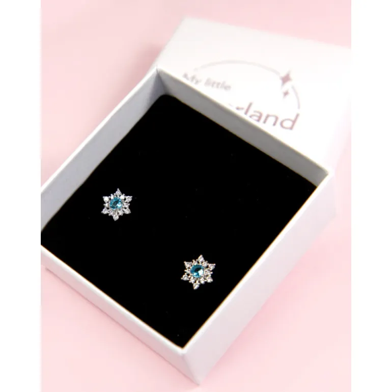 Unos pendientes muy elegantes que tienen la forma característica de un copo de nieve pero con el centro azul, como el traje de Elsa, y que podría llevar ella perfectamente. Miden en torno a 10 x 10 mm y son aptos para orejas perforadas. Tanto el pendiente como la tuerca Están fabricados en Plata de Ley, y en el centro tienen circonitas brillantes, en una combinación realmente acertada.