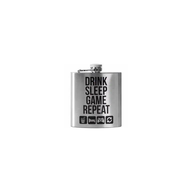 Una de las características destacadas de esta petaca es el mensaje impreso en su parte frontal, que dice «Drink, sleep, game, repeat» junto a los respectivos iconos asociados a cada actividad. Este distintivo proporciona un toque divertido y auténtico, permitiendo al portador expresar su estilo de vida y su amor por los videojuegos.