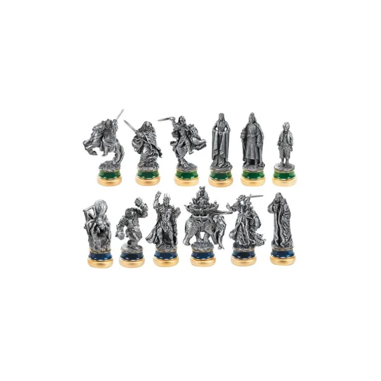 Descubre las Piezas de Ajedrez El Regreso del Rey, una exquisita colección inspirada en el icónico mundo de El Señor de los Anillos. Estas figuras están meticulosamente diseñadas para capturar el espíritu épico de la saga. Cada pieza, cuidadosamente tallada y con acabados en tonos plateados, destaca por su atención al detalle, representando a personajes emblemáticos como Aragorn, Gandalf, Frodo, y otros. Están montadas sobre bases ornamentadas en colores dorados y verdes, proporcionando estabilidad y un toque de elegancia a cualquier tablero de ajedrez.