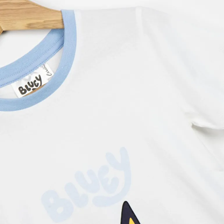 El cuello de la camiseta cuenta con un ribete azul que combina perfectamente con el diseño general, añadiendo un detalle de contraste atractivo. Con su diseño alegre y materiales de alta calidad, este pijama es la elección perfecta para cualquier pequeño fan de Bluey.