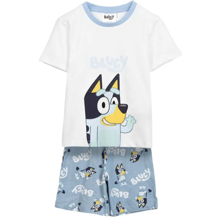 Descubre el encantador pijama corto inspirado en Bluey, ideal para los más pequeños de la casa. Este conjunto incluye una camiseta blanca con un llamativo estampado del querido personaje Bluey al frente, acompañado del logo en tonos suaves. Los pantalones cortos presentan un patrón repetido del personaje en un vibrante color azul claro, ideal para añadir un toque de diversión a la hora de dormir.