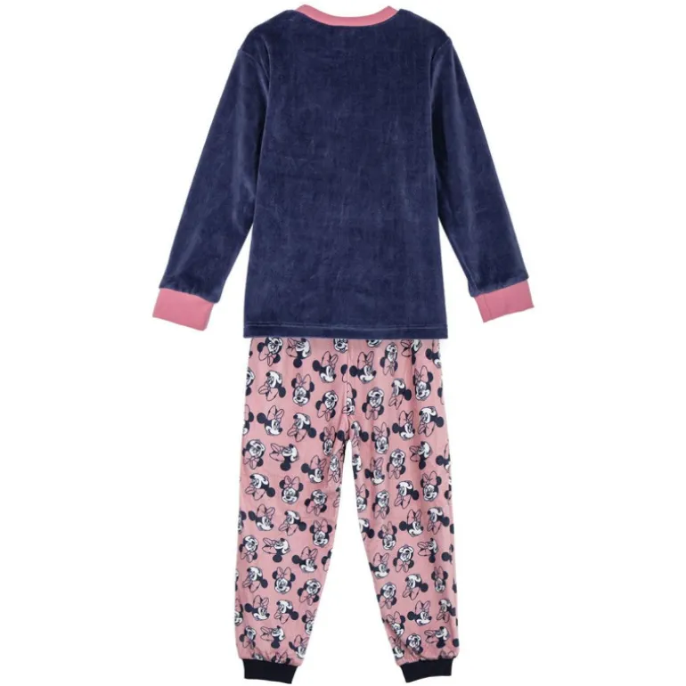 La parte inferior del pijama es un pantalón rosa con un estampado repetido de Minnie, perfecto para los pequeños admiradores de este icónico personaje. Los puños en negro en los bajos del pantalón aseguran un ajuste cómodo y seguro, manteniendo el calor cerca del cuerpo.