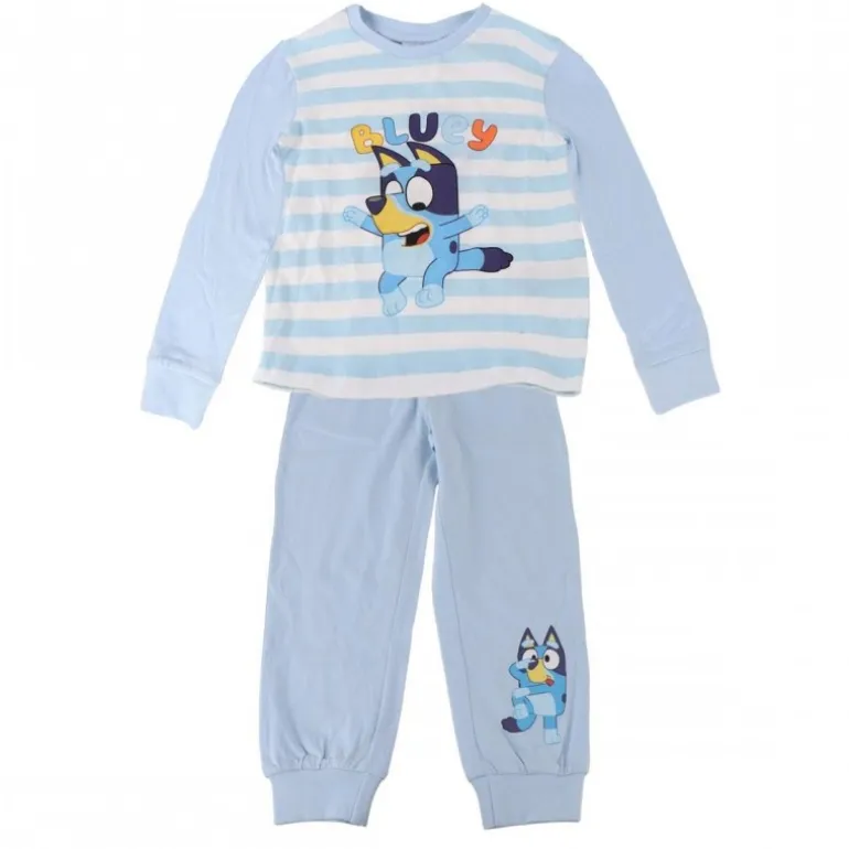 Este encantador pijama largo está diseñado especialmente para los pequeños fans de Bluey. Confeccionado en un suave 100% algodón, ofrece comodidad y calidez durante toda la noche. El diseño presenta una camiseta con mangas largas en tonos azules suaves y rayas blancas, adornada con una alegre imagen de Bluey en el centro. Los pantalones, también en tonos azules, cuentan con un ribete elástico en los tobillos para un ajuste perfecto. Disponible en tallas de 3 a 6 años, es el regalo perfecto para hacer de la hora de dormir un momento especial.