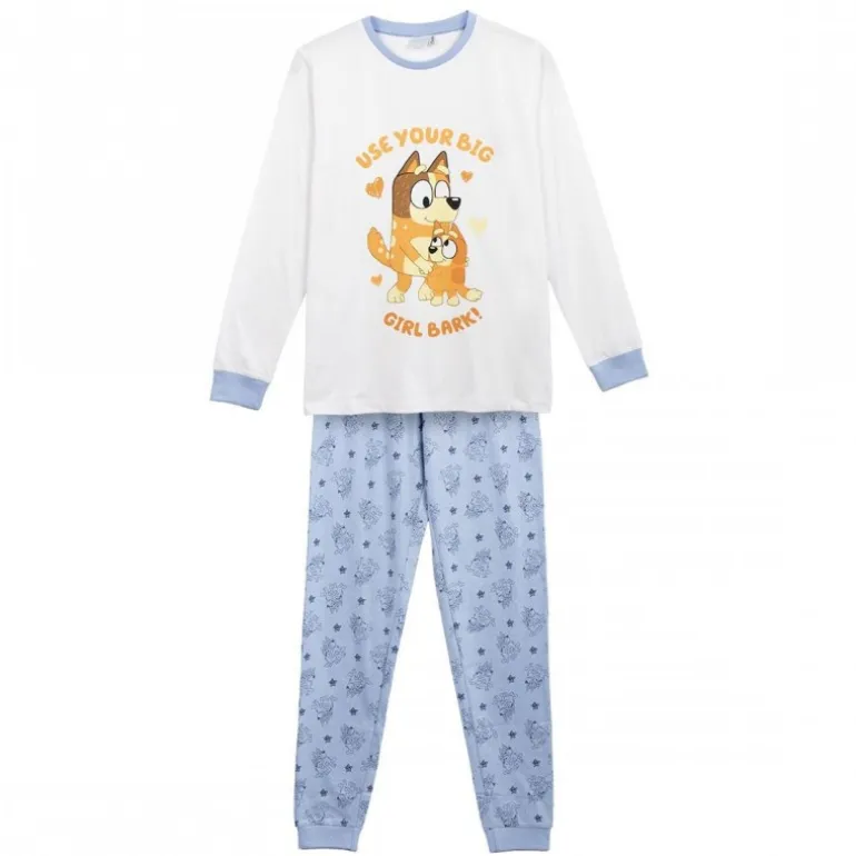Descubre el adorable pijama largo de Bluey, diseñado especialmente para los pequeños admiradores del famoso personaje. Este conjunto incluye una camiseta de manga larga en color blanco con detalles en azul claro en los puños y cuello. Destaca un encantador estampado de Bluey con el texto «Use Your Big Girl Bark!» en tonos amarillos y naranjas, que añade un toque de diversión y simpatía.