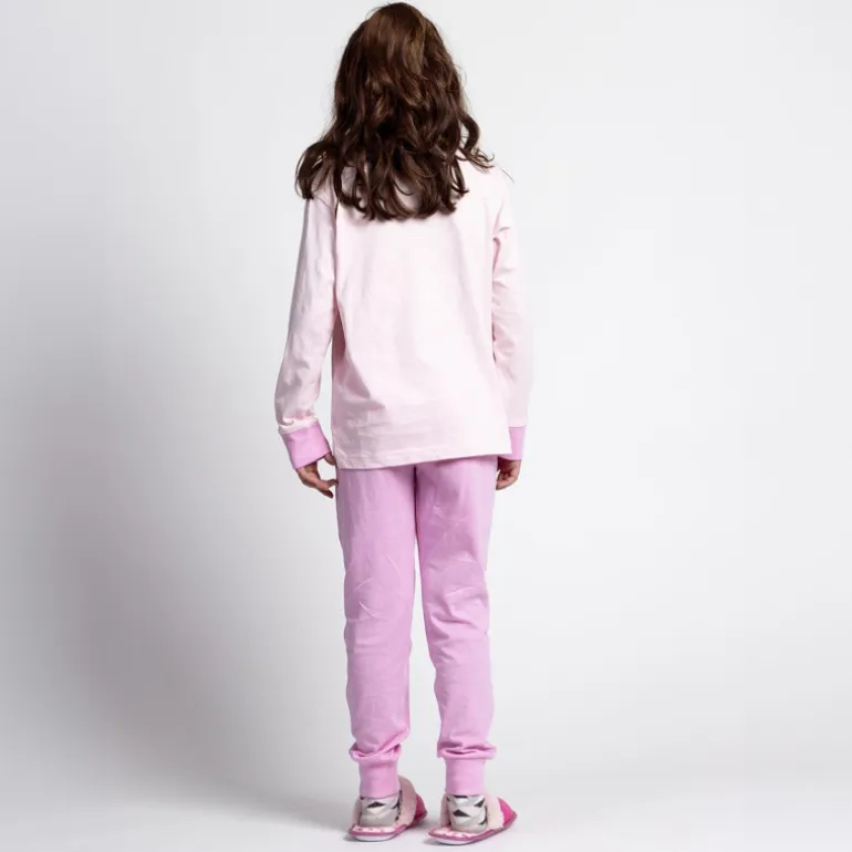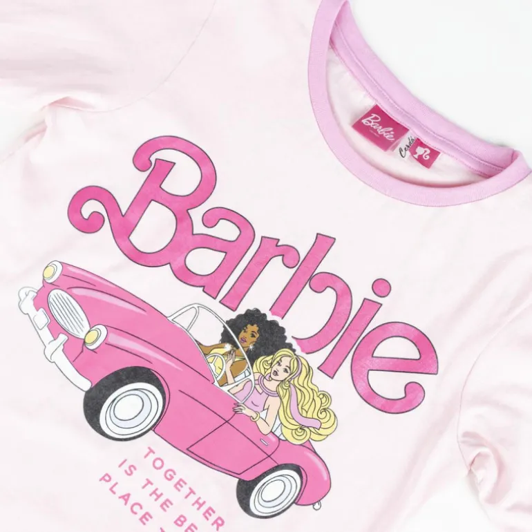 Descubre el encantador pijama Barbie de diseño exclusivo, ideal para peques de 8 a 14 años. Este conjunto presenta un vibrante color rosa suave con detalles en rosa más intenso en los puños y cuello. La camiseta de manga larga luce un divertido estampado de Barbie conduciendo un coche rosa, acompañado de la frase «Together is the best place to be». Los pantalones siguen el mismo esquema cromático, con el nombre de Barbie estampado en vertical en una de las piernas.