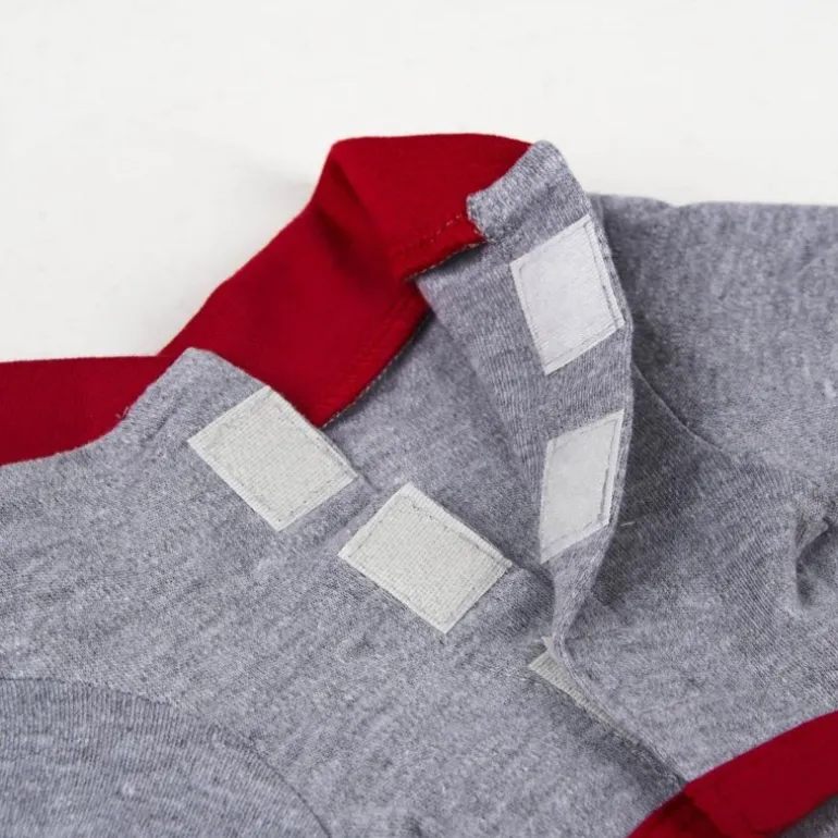Viste a tu mascota con el encanto de Disney con este pijama para perro inspirado en Mickey. La prenda está confeccionada en un suave tejido de color gris, adornado con detalles en rojo vibrante en el cuello y los puños, que añaden un toque de alegría y color.