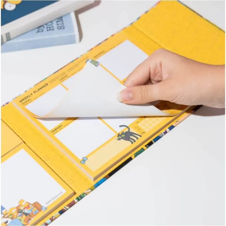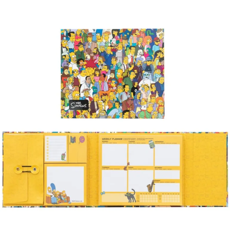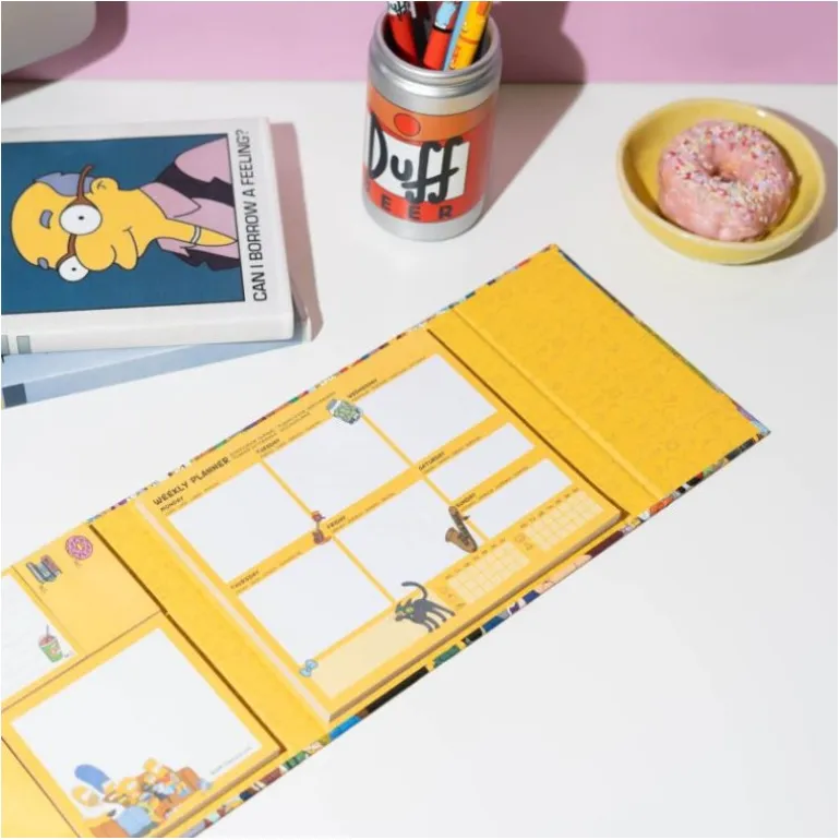 Este planificador semanal de The Simpsons combina funcionalidad y diseño icónico. La cubierta muestra a los famosos personajes de Springfield en un llamativo collage lleno de color. El planificador de 181 x 152 mm es ideal para organizar tus semanas, mientras que los bloques de notas de varios tamaños facilitan la gestión de recordatorios y tareas.