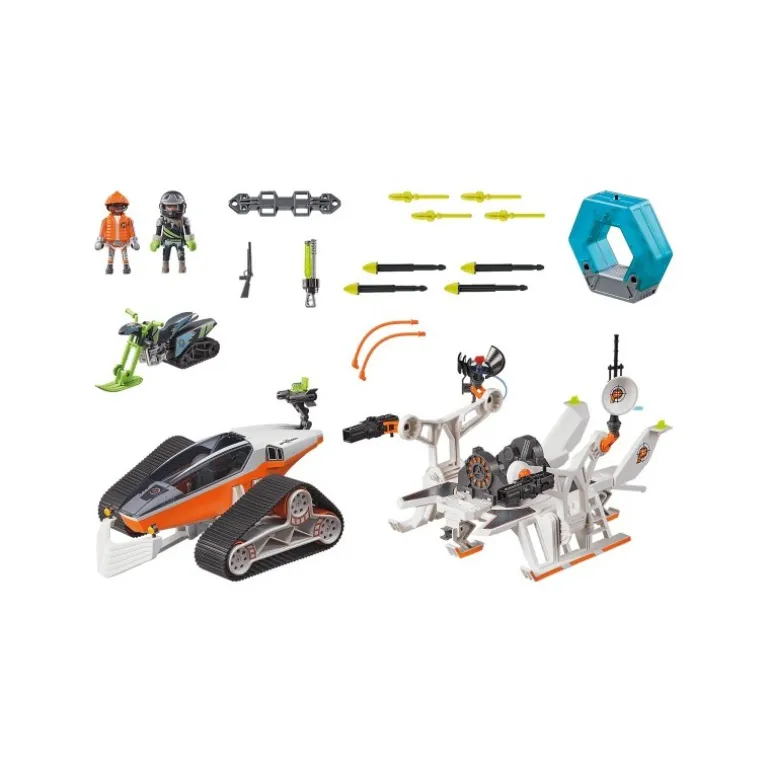 ¡Explora el mundo de los agentes secretos con el Playmobil Espías Spy Team Comando Nieve! Este set incluye un vehículo futurista con detalles en blanco y naranja, equipado con orugas robustas para atravesar cualquier terreno nevado. Con espacio para dos figuras, este comando es perfecto para misiones emocionantes.