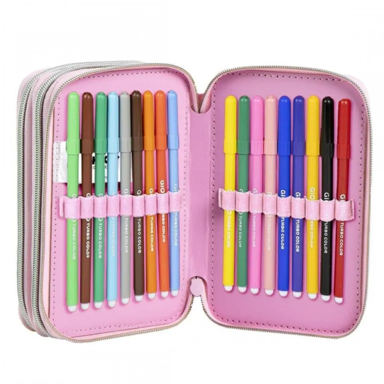 El plumier Giotto Minnie es la opción ideal para las pequeñas artistas. De un encantador color rosa, este plumier destaca por su diseño protagonizado por Minnie y Daisy, haciendo de cada día escolar una aventura mágica. Fabricado en 100% poliéster, ofrece resistencia y durabilidad. El plumier cuenta con tres secciones con cremalleras multicolores para asegurar los materiales.