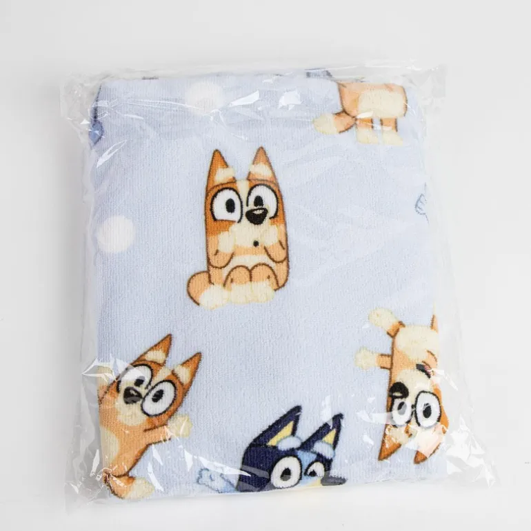 El diseño en **tonos azules claros** presenta a los adorables personajes de **Bluey**, lo que atraerá la atención de los niños y los hará sentir parte de sus aventuras favoritas. Con un fondo azul decorado con divertidos estampados de los personajes, este poncho no solo es cómodo, sino también visualmente atractivo.