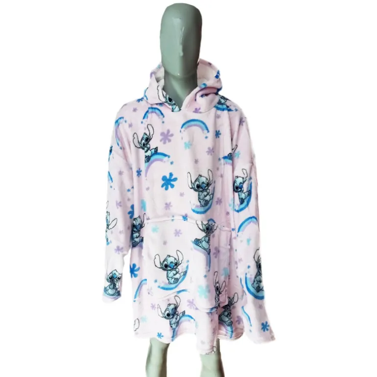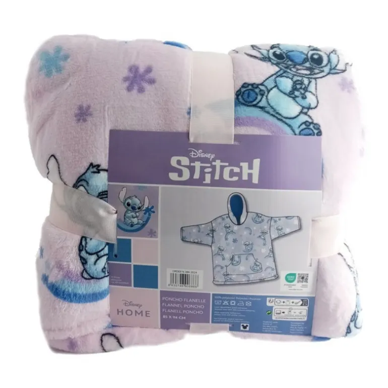 Una de las características más destacadas del «Poncho Stitch rosa franela» es su práctico diseño, que incluye un amplio bolsillo tipo canguro en la parte delantera. Este bolsillo no solo añade un elemento funcional, permitiendo mantener las manos cálidas y al mismo tiempo ofrecer un lugar conveniente para guardar pequeños objetos, sino que también resalta la versatilidad del producto. Es ideal para aquellos momentos de ocio en los que uno desea disfrutar de una película, leer un libro o simplemente descansar.
