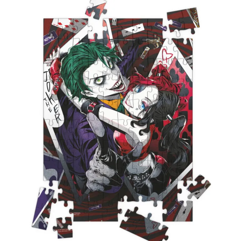Un maravilloso puzzle de 100 piezas inspirado en la pareja de villanos más gamberra de Gotham City y DC Comics: Joker y Harley Quinn.