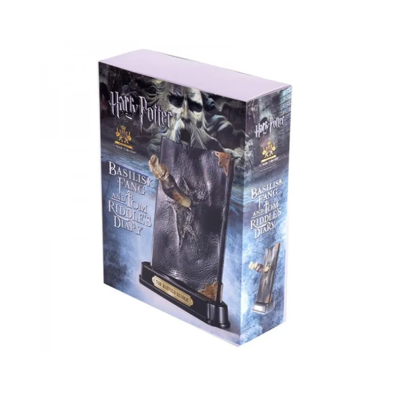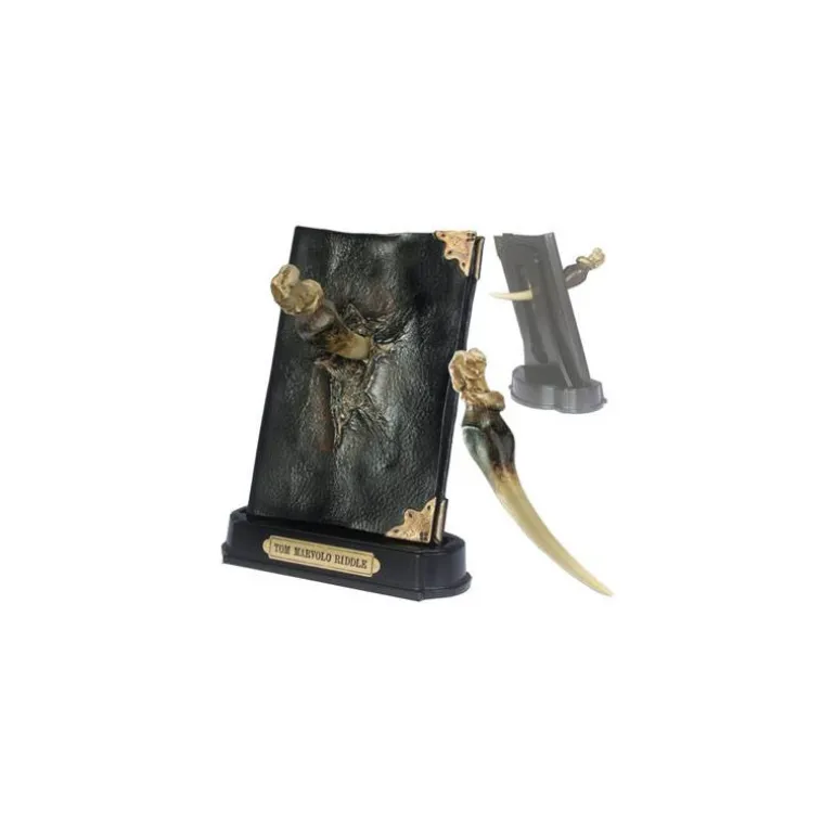 Esta réplica del Diario de Tom Riddle de unos 23cm de altura e incluye también el colmillo del basilisco que usa Harry Potter contra él. Además es una pieza independiente que podrás extraer para ver el agujero que ha dejado en el diario.
