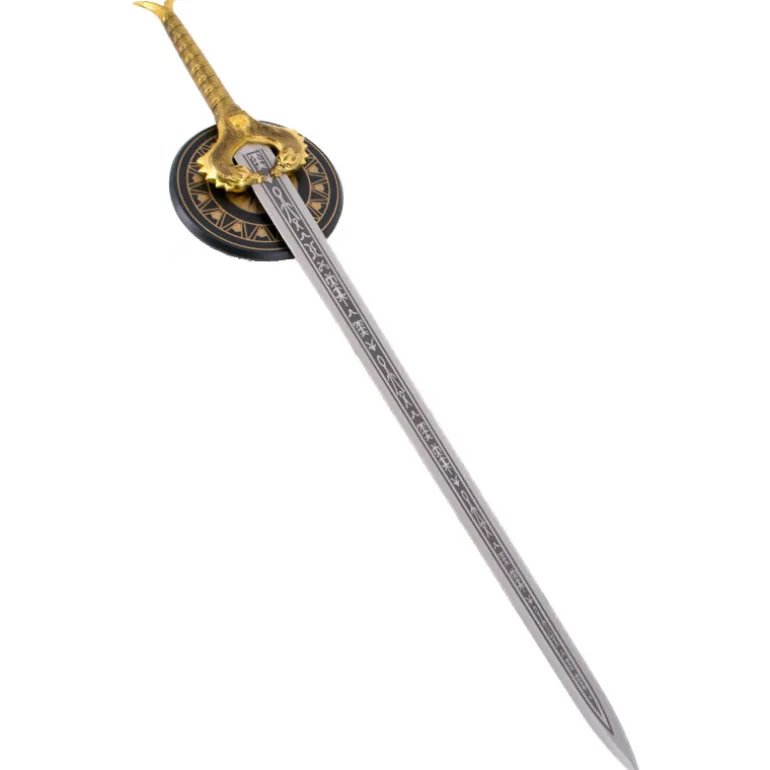 Esta hecha de acero y viene con un soporte decorativo diseñada para la espada.