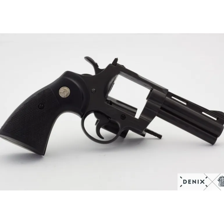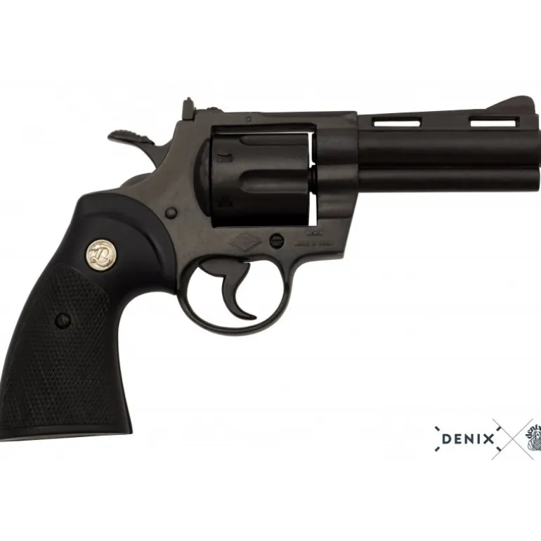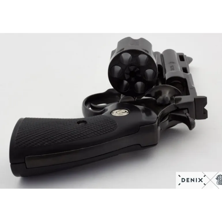 Descubre el lujo y la precisión de esta reproducción del icónico revólver Colt Python de 1955. Fabricado por Denix, este revólver de doble acción y calibre .357 Magnum es famoso en el mundo del cine y los videojuegos, apareciendo en títulos como Resident Evil y series como The Walking Dead.