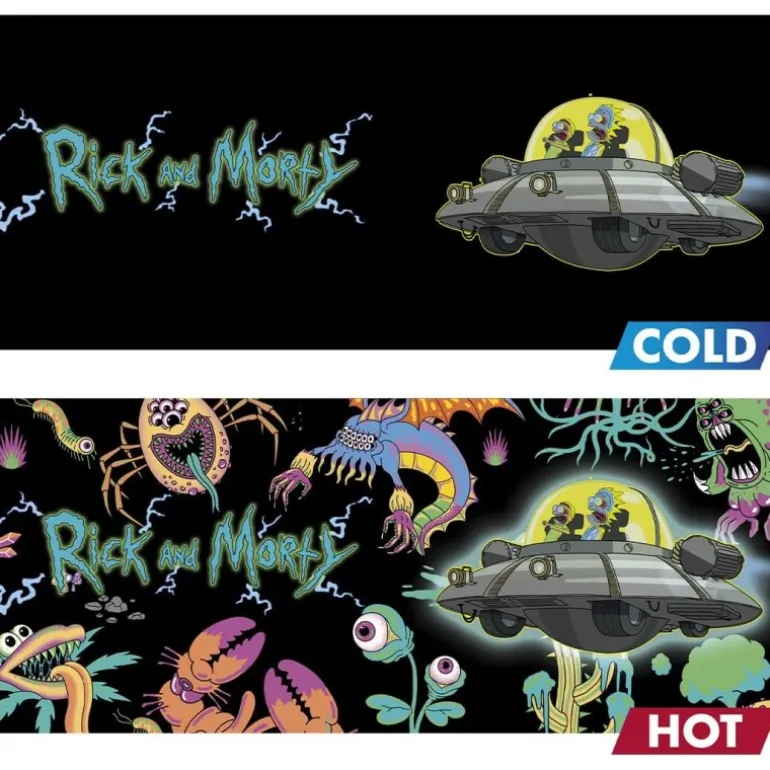 Descubre la taza térmica de Rick and Morty con capacidad de 460 ml, un producto oficial de ABYstyle que no solo es funcional, sino también un deleite visual para cualquier aficionado de la serie. Esta taza presenta un diseño espectacular con la imagen de la emblemática nave espacial de los personajes en un ambiente intergaláctico. Cuando la taza está fría, el fondo es negro con la nave en primer plano. Al añadir una bebida caliente, el fondo revela un vibrante paisaje alienígena lleno de colores brillantes, enriqueciendo la experiencia con cada sorbo.