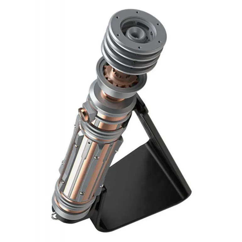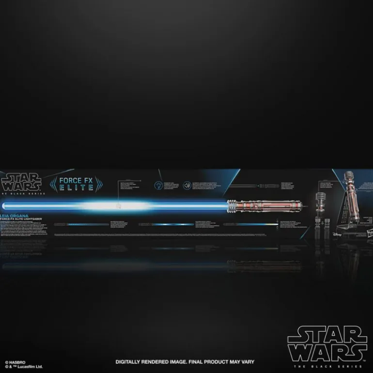 Viene en una cuidada caja especialmente diseñada para este modelo y tiene una peana trasparente muy elegante para que lo puedas exponer en tu casa cuando no lo estés utilizando para derrocar al Imperio; y una funda de tela para guardarlo en perfectas condiciones.