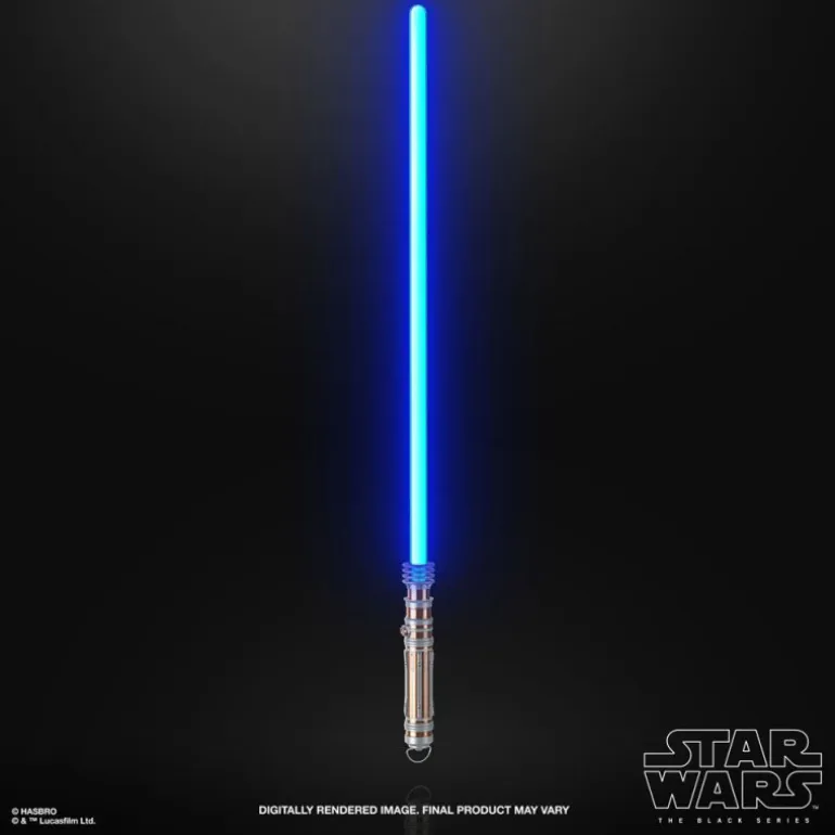 Este sable no es ningún juguete, sino que se trata de una fiel réplica del original con la empuñadura de metal, por lo que es enorme y pesado. Mide más de un metro en total, 115 cm. exactamente y pesa más de 1 Kg, de modo que no deberá dejarse al alcance de los niños o tenerlos vigilados mientras lo tienen. Tiene la hoja azul desmontable y cuenta con unos efectos de luz y sonido totalmente conseguidos y muy realistas. Funciona con 3 pilas AA (no incluidas).