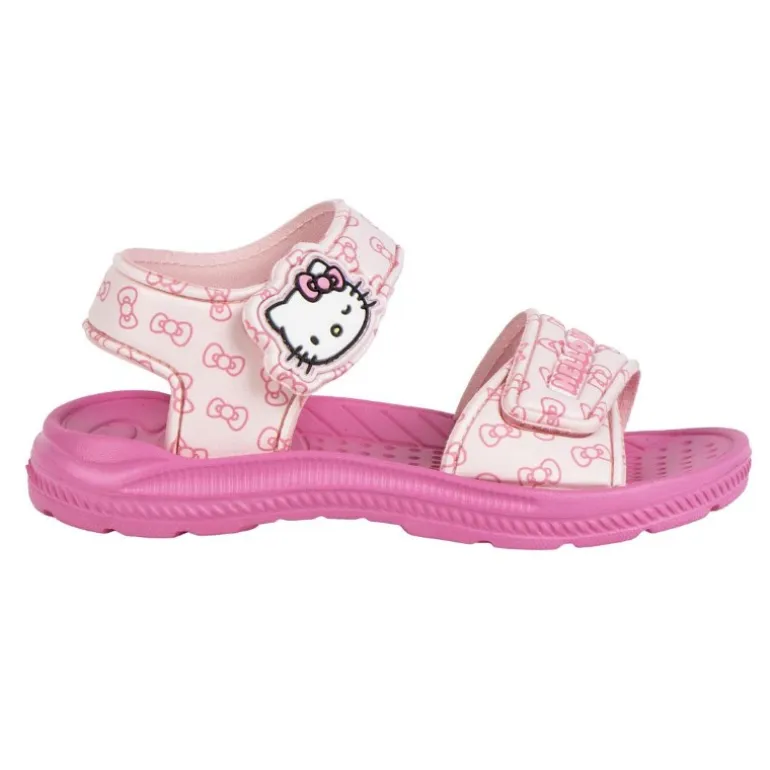 El diseño destaca por su vibrante color rosa y los adorables gráficos de Hello Kitty, que adornan tanto la parte superior como la suela. Las tiras ajustables aseguran un calce perfecto, permitiendo que los pies de tus hijos se mantengan seguros y cómodos mientras juegan. La suela proporciona un agarre adecuado, ideal para superficies mojadas.