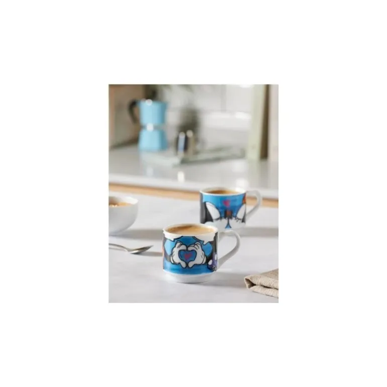 Las tazas muestran una vibrante ilustración de Mickey y Minnie compartiendo un dulce momento, con un fondo azul que resalta los detalles en blanco y negro de los personajes. Las tazas cuentan con el mensaje romántico «tu mi completi», añadiendo un toque especial y personal a cada sorbo.