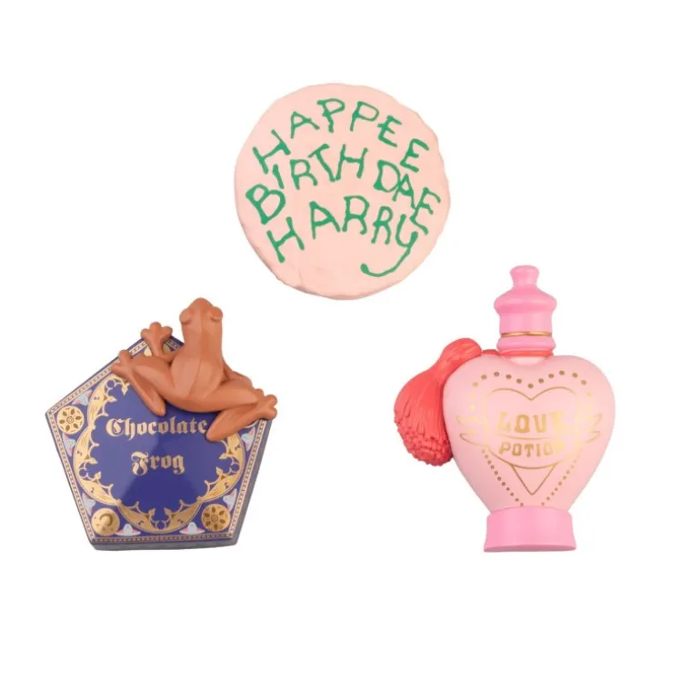 Descubre el encantador set de 3 imanes Harry Potter, que incluye una Rana de Chocolate, una Poción Amortentia y una Tarta de Hagrid. Cada pieza está meticulosamente modelada en 3D y cuenta con un imán en la parte trasera, perfecto para adornar tu nevera con el mágico mundo de Hogwarts. Fabricados con PVC y mineral de hierro magnetita, estos imanes poseen gran durabilidad y un diseño auténtico. Con medidas aproximadas de 5 x 6 x 2 cm, son compactos y detallados. Producto con licencia oficial, ideal para fans de Harry Potter que buscan un toque original para su hogar o un regalo especial.