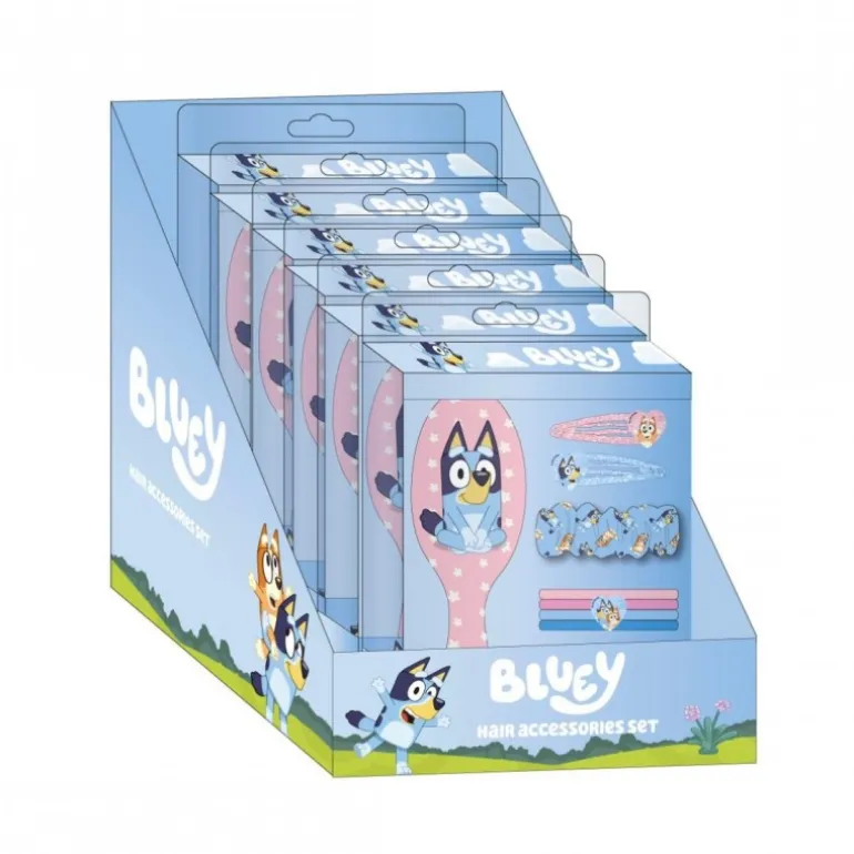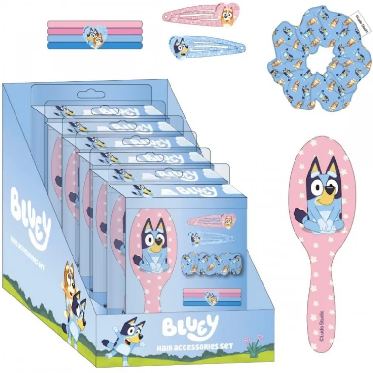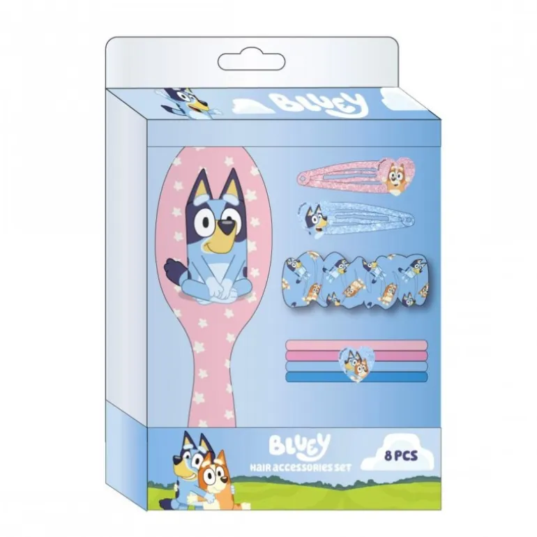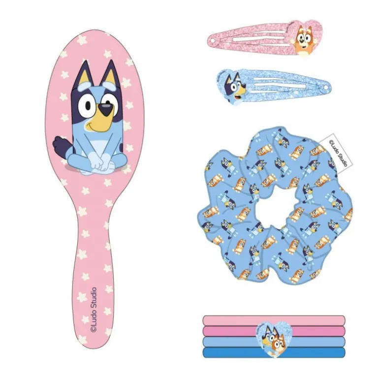 Descubre el encantador Set de Belleza Bluey, diseñado especialmente para los pequeños admiradores de este adorable personaje. Este conjunto incluye todos los esenciales para arreglar el cabello de los niños de manera divertida y colorida. El set se compone de una escobilla de pelo con un diseño alegre de Bluey sobre un fondo rosado, decorado con estrellas blancas. Incluye también horquillas a juego en tonos azules y rosados, adornadas con imágenes de Bluey y sus amigos.