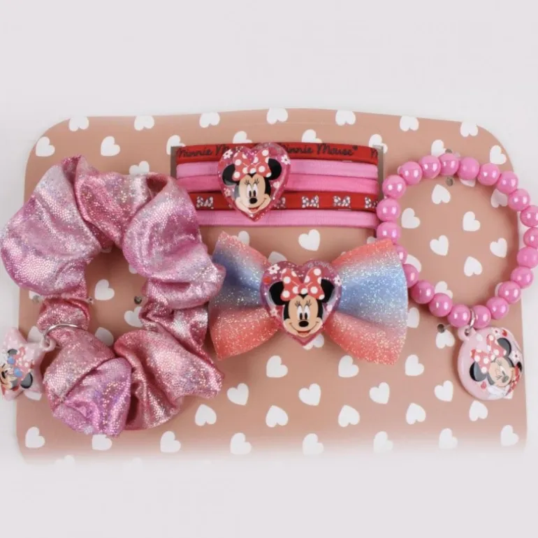 Este encantador set de belleza de Minnie Mouse es perfecto para las más pequeñas que adoran a la icónica ratoncita. El bolsito transparente con detalles en rojo y rosa está decorado con corazones y la imagen de Minnie, y contiene una colorida selección de accesorios encantadores. Dentro encontrarás una pulsera de perlas rosas, un coletero brillante en tonos rosas, un juego de gomas para el cabello con decoración de Minnie y un lazo con los colores del arcoíris y un aplique de Minnie en el centro. Cada pieza está diseñada cuidadosamente para añadir un toque de diversión y estilo. Ideal para niñas que quieren llevar la magia de Disney a su día a día.