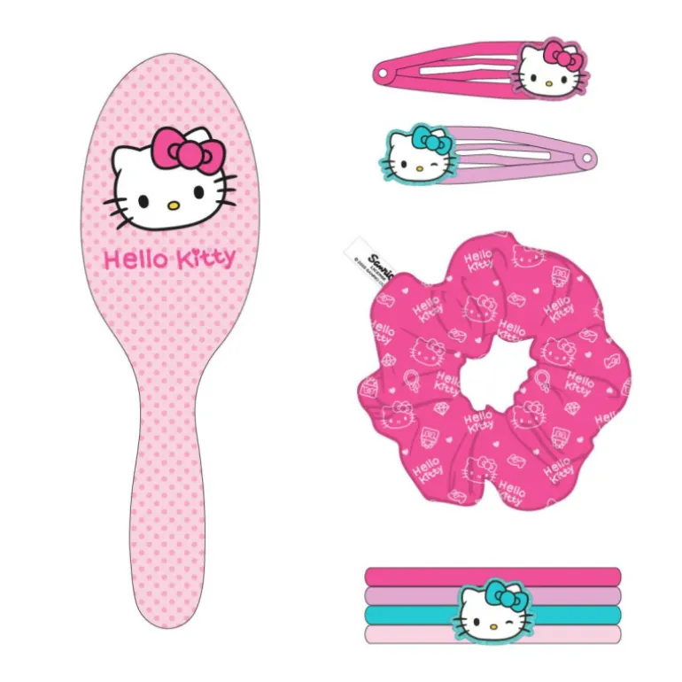 - Incluye: Cepillo para el cabello con diseño de Hello Kitty y un patrón de puntos en rosa, dos horquillas para el pelo en tonos fucsia y lila con apliques de la mascota, una goma elástica con logotipos de Hello Kitty en rosa intenso, y tres bandas para el cabello en colores azul, fucsia y blanco.