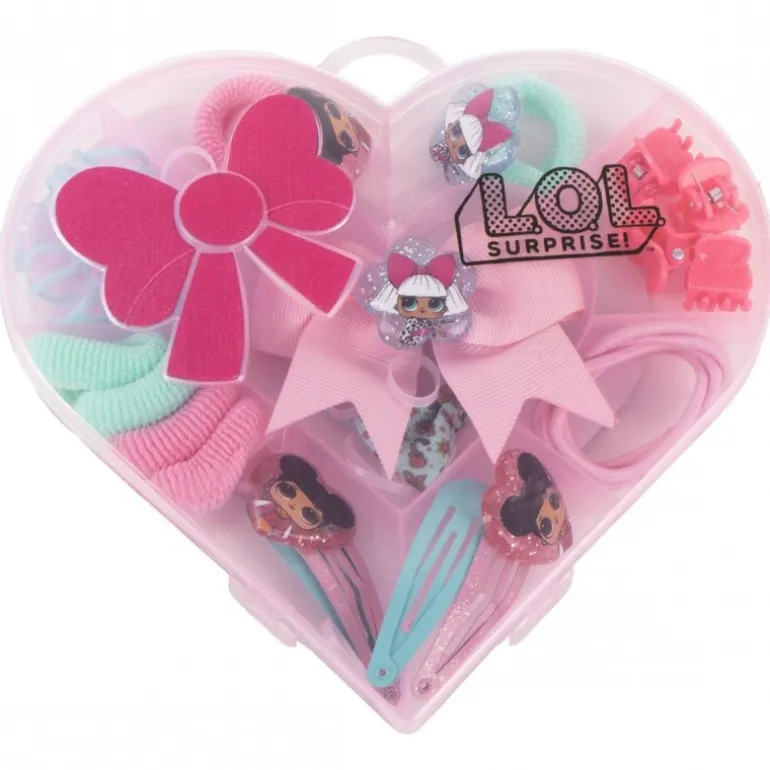 Descubre el encantador Set de Belleza LOL, perfecto para las pequeñas amantes de la moda. Este set incluye 20 piezas de accesorios para el cabello, cuidadosamente organizadas en una caja con forma de corazón de color rosa. Dentro de la caja encontrarás una variedad de ligas, pinzas y horquillas decoradas con los icónicos personajes de LOL Surprise. Especialmente diseñado para añadir un toque de diversión y estilo al peinado de las niñas, este set es ideal para cualquier ocasión.