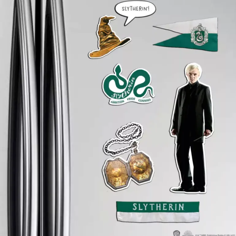 Es un conjunto de imanes inspirados en la famosa Casa Slytherin de Hogwarts, el colegio de magia y hechicería más popular de la saga. Fíjate bien porque en estos imanes podrás encontrar cositas tan icónicas como Guardapelo de Salazar Slytherin, el Sombrero Seleccionador o incluso al mismísimo Draco Malfoy, una de las alumnos más representativos de Slytherin.