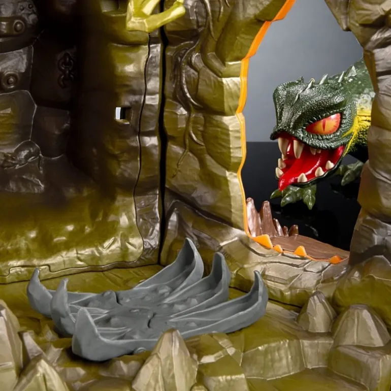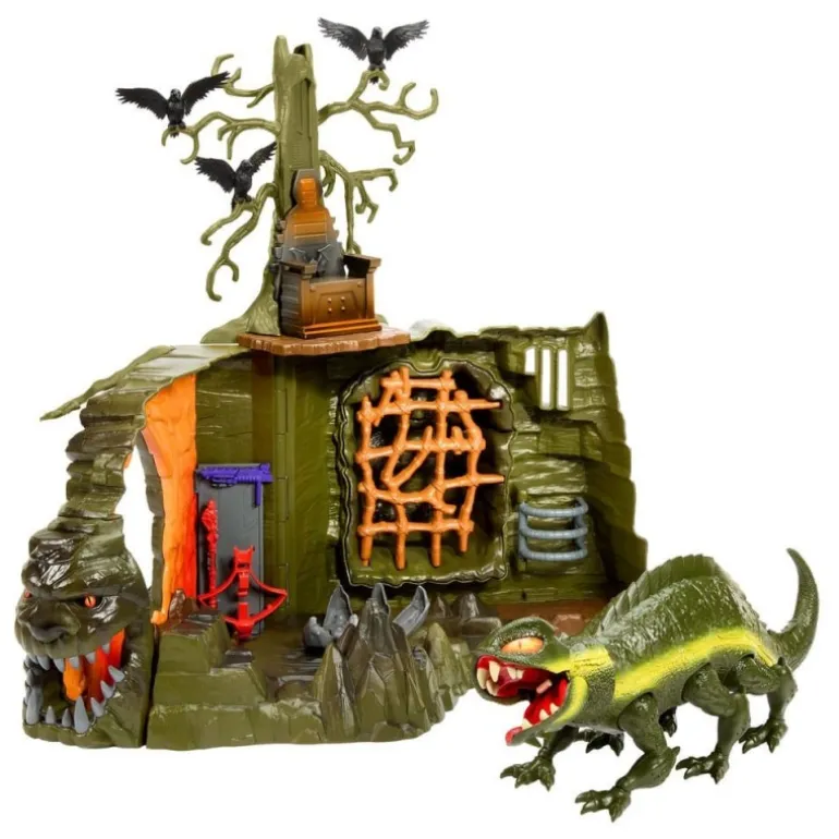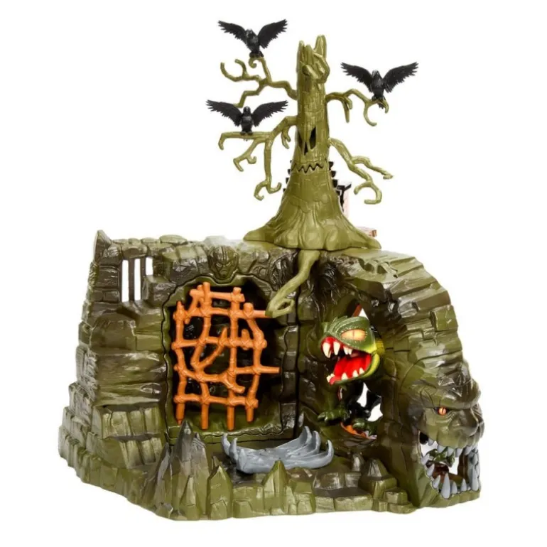 El set presenta una estructura enigmática de color verde oscuro que evoca una atmósfera sombría y peligrosa, complementada por figuras de animales aterradores y un árbol retorcido que domina la escena. La puerta de entrada, con su diseño de mandíbula abierta, es un toque escalofriante que invita a los héroes a enfrentar sus peores miedos.