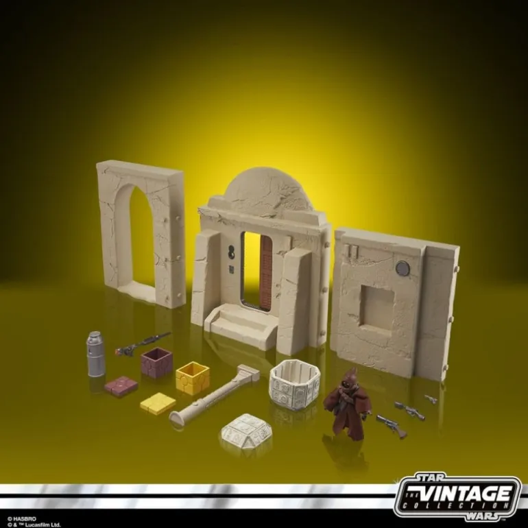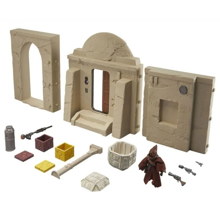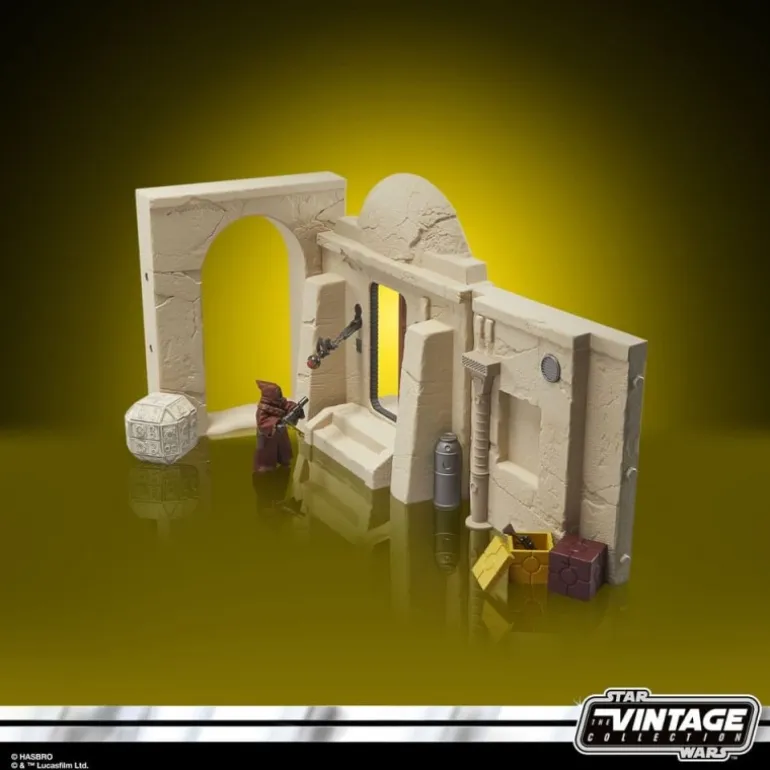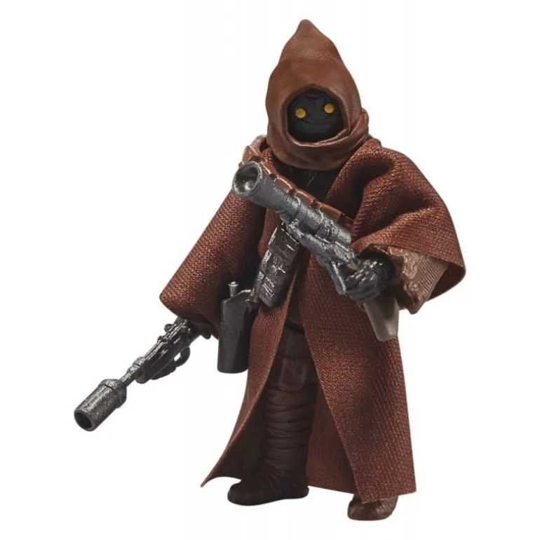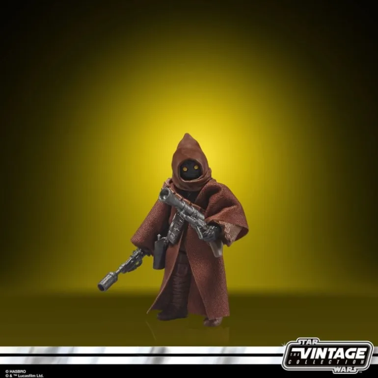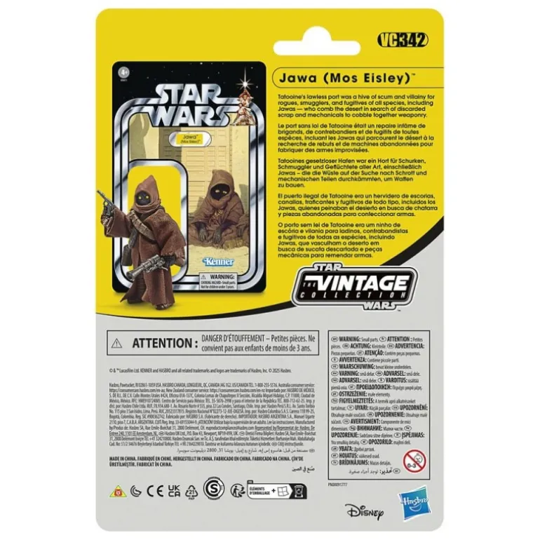 La escena recrea las icónicas calles de Mos Eisley, haciendo uso de materiales de alta calidad y un diseño fiel al estilo vintage que los coleccionistas valoran. La figura del Jawa viene con su característico manto y accesorios, y está empaquetada en un blister que recuerda a las figuras originales, incluyendo el sello distintivo de Kenner.