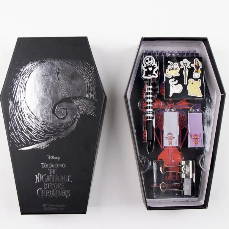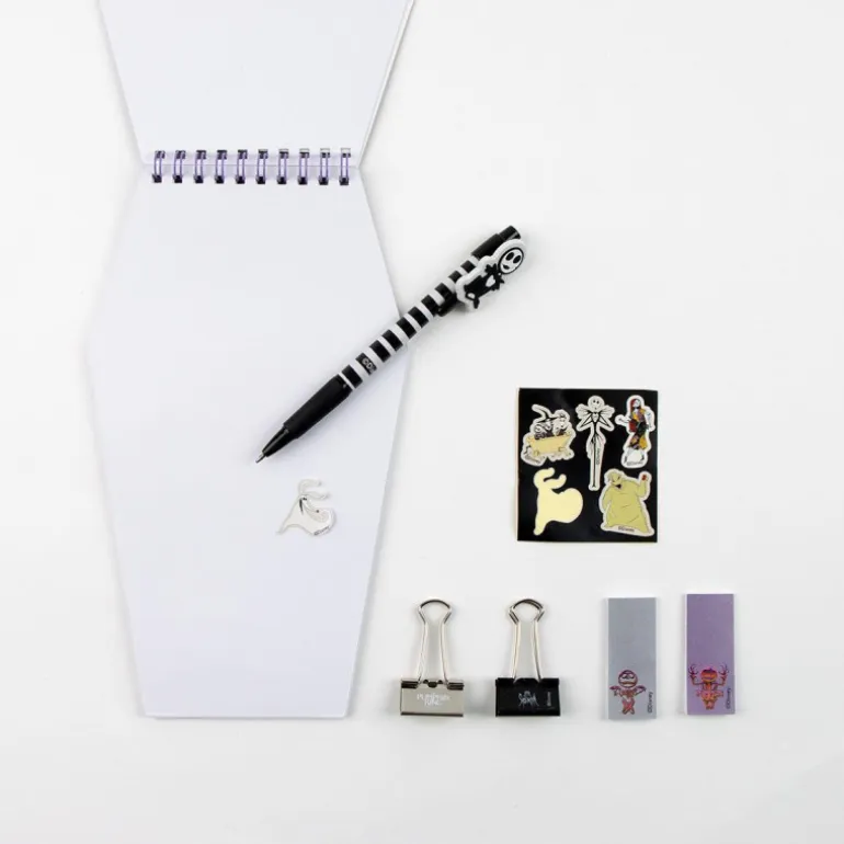 Dentro de esta peculiar caja, se encuentran un cuaderno, un boli, dos sets de notas adhesivas, dos clips y pegatinas, todo con la temática de Pesadilla antes de Navidad. Con licencia oficial, este set de papelería es ideal para los fans de esta famosa película.