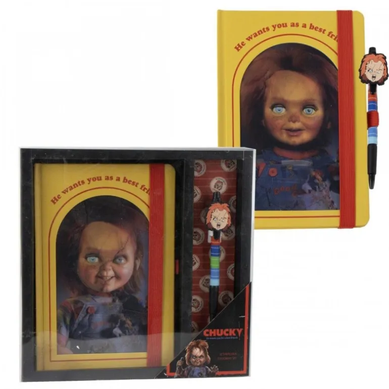 Descubre el Set de Papelería Chucky, perfecto para los amantes del icónico personaje de terror. Este conjunto incluye un cuaderno y un bolígrafo, ambos adornados con detalles que capturan la esencia inquietante de Chucky.