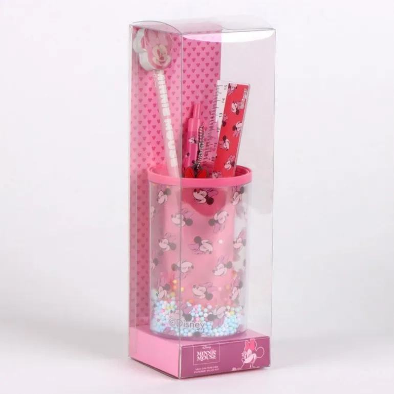 Descubre este encantador set de papelería de Minnie Mouse, ideal para agregar un toque de diversión y color a cualquier escritorio. Este conjunto incluye un práctico portalápices de color rosa vibrante decorado con el icónico diseño de Minnie Mouse, lleno de detalles que capturan su alegre personalidad. También encontrarás un bolígrafo, una regla de 15 cm y un lápiz, todos a juego y con divertidos estampados de Minnie en tonos rosados y blancos. El portalápices, adornado con pequeñas bolas de colores en su base, es perfecto para mantener organizados tus utensilios de escritura mientras añade un toque decorativo a tu espacio. Este set es una opción fantástica para los fans de Disney que buscan combinar utilidad con estilo.