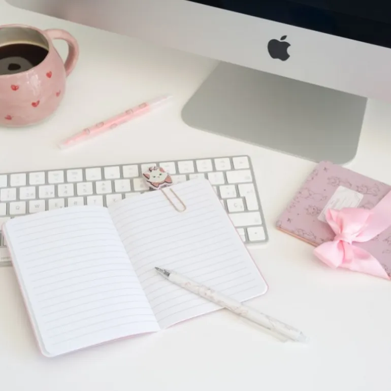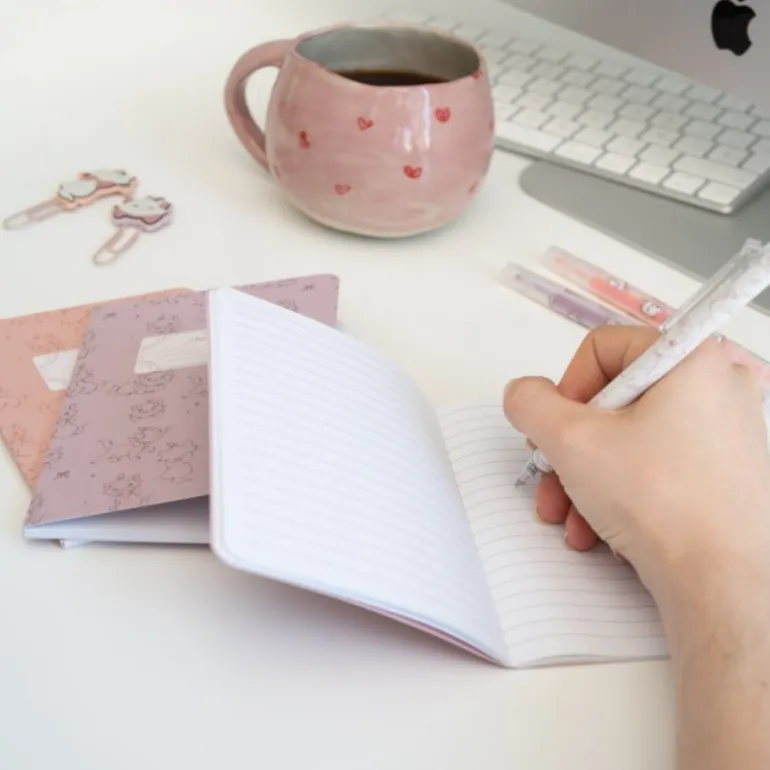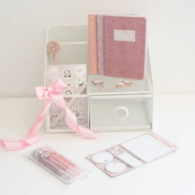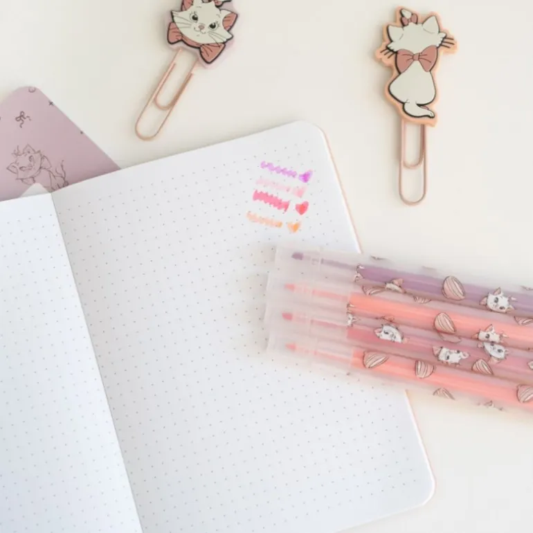 Este set, inspirado en la entrañable gatita Marie de Los Aristogatos, incluye todo lo que necesitas para añadir estilo y funcionalidad a tu escritorio. Dentro de una práctica bolsa de PU y PVC con cremallera encontrarás tres cuadernos tamaño A6 ideales para notas y bocetos, un lápiz con un encantador tope de goma de borrar, dos clips con topper, un pack de sticky notes, y un estuche con cuatro subrayadores para destacar tus notas importantes.