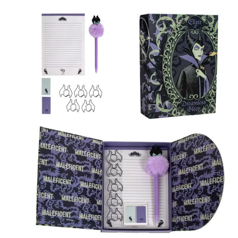 El Set de papelería de Maléfica es un artículo que combina estética y funcionalidad, diseñado especialmente para los amantes de la icónica figura de Maléfica, uno de los personajes más emblemáticos del universo Disney. Este elegante conjunto se presenta en una caja decorativa, que muestra una hermosa ilustración de Maléfica en su portada, lo que lo convierte en un objeto de deseo no solo por su contenido, sino también por su atractivo diseño exterior.