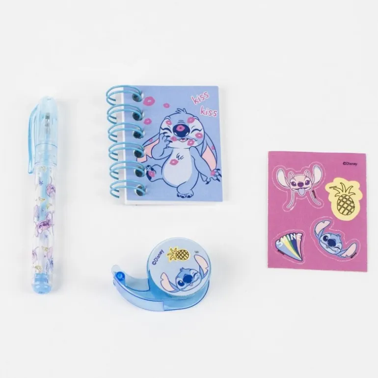 Descubre el Set de Papelería Minimochila de Stitch, un conjunto encantador que ofrece todo lo necesario para que los más pequeños disfruten de la escritura y el dibujo. Este set incluye una linda minimochila de color azul claro con un diseño de Stitch en el frente, decorado con un corazón rosa y pequeños detalles de piñas.