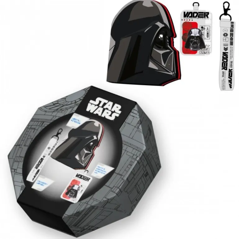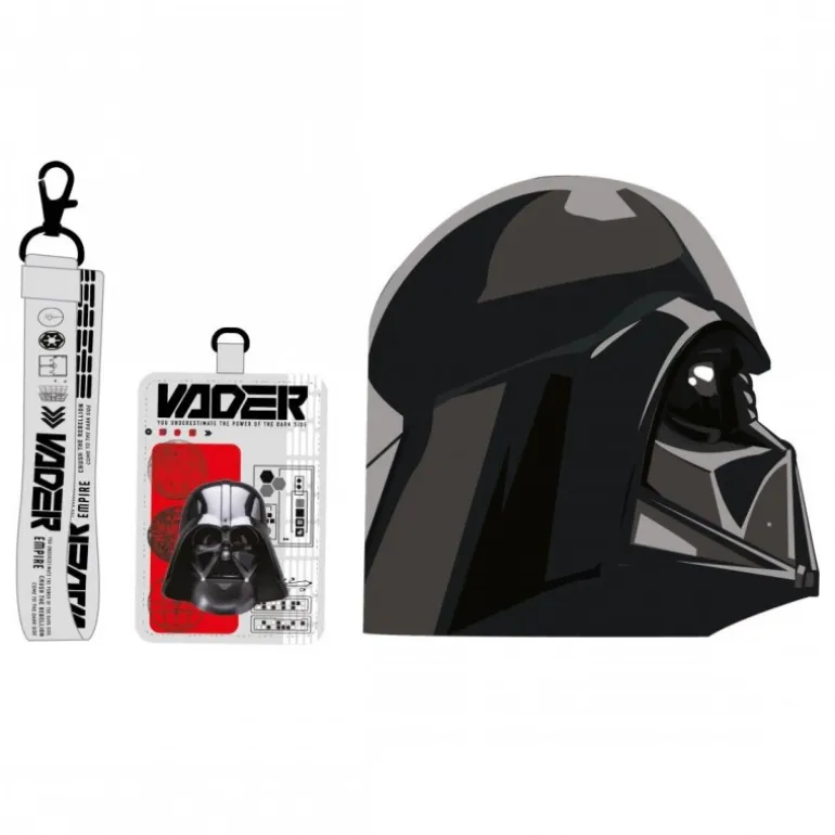 Dentro del set, encontrarás una libreta con la silueta de Darth Vader, ideal para tus anotaciones diarias o para llevar la cuenta de tus aventuras intergalácticas. Además, incluye una tarjeta identificativa con un lanyard, ambos decorados con imágenes y elementos gráficos de Star Wars y Vader, perfectos para llevar tus credenciales con estilo.