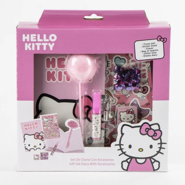 Descubre el encantador Set Diario Hello Kitty, ideal para los pequeños amantes de esta icónica gatita. Este set multicolor incluye un diario con candado de impresión vibrante que presenta a Hello Kitty en una portada rosa dulce. Viene acompañado de un bolígrafo decorado con un suave pompón rosa, perfecto para hacer que la escritura sea un placer estético. El conjunto no estaría completo sin una hoja llena de adhesivos temáticos de Hello Kitty y una goma de borrar con el mismo diseño adorable. Además, se incluye un tubo de pegamento con purpurina para personalizar aún más las páginas del diario y una bolsa de lentejuelas que añade un toque brillante a cualquier proyecto creativo. Todo esto se presenta en un empaque atractivo, ideal para regalar. Este set fomenta la creatividad y es perfecto para estimular la escritura y la expresión artística en los niños.