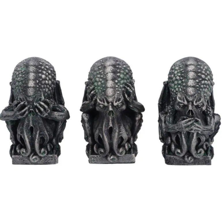 Se trata de set de tres figuras de 7 cm fabricada en poliresina, con un montón de detalles y un trabajo de pintura a mano espectacular, que nos muestra a este antiguo dios con esa intrincada forma mezcla de pulpo, dragón y humanoide. Es una escultura excepciona con extraordinarios detalles para que el realismo sea total. Con Cthulhu con diferentes expresiones.